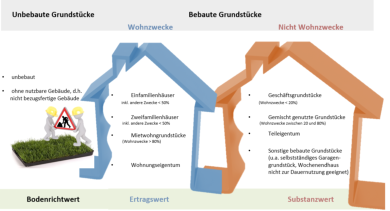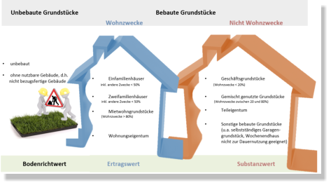 Hier geht es nicht nur um die Frage ob bebaut oder unbebaut. Unbebaute Grundstück sind zumeist der einfachste Fall, bei allen anderen muss geklärt werden, ob es sich um eine Bebauung für Wohnzwecke oder Nichtwohnzwecke handelt. Nach der Eingruppierung richtet sich im nächsten Schritt die Flächenermittlung. Müssen Sie später die Wohnfläche oder die Bruttogrundfläche ermitteln? Entscheiden Sie für Ihre Grundstücke zwischen:•unbebautes Grundstück•bebautes Grundstück - Wohnzwecke•bebautes Grundstück - Nichtwohnzweckeam besten nach diesem Schaubild:(ein Klick vergrößert)Die Prozentgrenzen betreffen immer die Gegenüberstellung von Wohn- zu Nutzflächen in der konkreten Nutzung zum Bewertungsstichtag 1. Januar 2022. Wohnflächen berechnen sich wie hier, Nutzflächen nach DIN 277, hier zählen im Wesentlichen auch die Nebenräume mit. Die Nutzfläche ist NICHT die Bruttogrundfläche, die später gegebenenfalls für die Substanzwertermittlung benötigt wird.Stehen auf einem Grundstück mehrere Gebäude mit unterschiedlicher Nutzunge, wird das Verhältnis von Wohn- zu Nutzfläche wie vorstehend ermittelt und zwar über alle Gebäude hinweg in Summe. Im Ergebnis werden dann ALLE Gebäude entweder im Ertragswert- oder Substanzwertverfahren bewertet.