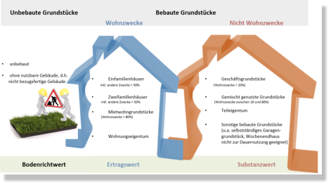 Hier geht es nicht nur um die Frage ob bebaut oder unbebaut. Unbebaute Grundstück sind zumeist der einfachste Fall, bei allen anderen muss geklärt werden, ob es sich um eine Bebauung für Wohnzwecke oder Nichtwohnzwecke handelt. Nach der Eingruppierung richtet sich im nächsten Schritt die Flächenermittlung. Müssen Sie später die Wohnfläche oder die Bruttogrundfläche ermitteln? Entscheiden Sie für Ihre Grundstücke zwischen:•unbebautes Grundstück•bebautes Grundstück - Wohnzwecke•bebautes Grundstück - Nichtwohnzweckeam besten nach diesem Schaubild:(ein Klick vergrößert)Die Prozentgrenzen betreffen immer die Gegenüberstellung von Wohn- zu Nutzflächen in der konkreten Nutzung zum Bewertungsstichtag 1. Januar 2022. Wohnflächen berechnen sich wie hier, Nutzflächen nach DIN 277, hier zählen im Wesentlichen auch die Nebenräume mit. Die Nutzfläche ist NICHT die Bruttogrundfläche, die später gegebenenfalls für die Substanzwertermittlung benötigt wird.Stehen auf einem Grundstück mehrere Gebäude mit unterschiedlicher Nutzunge, wird das Verhältnis von Wohn- zu Nutzfläche wie vorstehend ermittelt und zwar über alle Gebäude hinweg in Summe. Im Ergebnis werden dann ALLE Gebäude entweder im Ertragswert- oder Substanzwertverfahren bewertet.